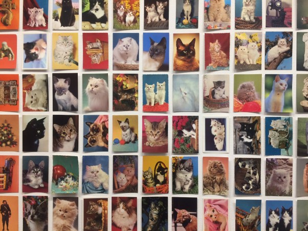 Pots deturar-te en detalls concrets, jugar a identificar les imatges i els grups temàtics, i acabar rient de l’absurd que resulta veure agrupades centenars de postals similars: el Valle de los Caidos o el rellotge de flors de Ginebra des de diferents angles, centenars d’entranyables gatets, interiors de teatres d’òpera tan similars que resulta impossible identificar-los, i així fins a l’infinit.