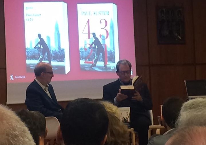 Fa un mes que Paul Auster està de gira presentant el seu nou llibre 4,3,2,1 i li costa saber a quina ciutat es desperta. Avui està a Barcelona, com a cap de cartell de la Setmana del Llibre en català que se celebra davant de la Catedral. És una estrella de les lletres i es veu a simple vista observant les dues fileres de Vips i la gran quantitat de gent que omple la sala. Es percep una vibració similar a la d’abans del concert d’una gran banda de rock.