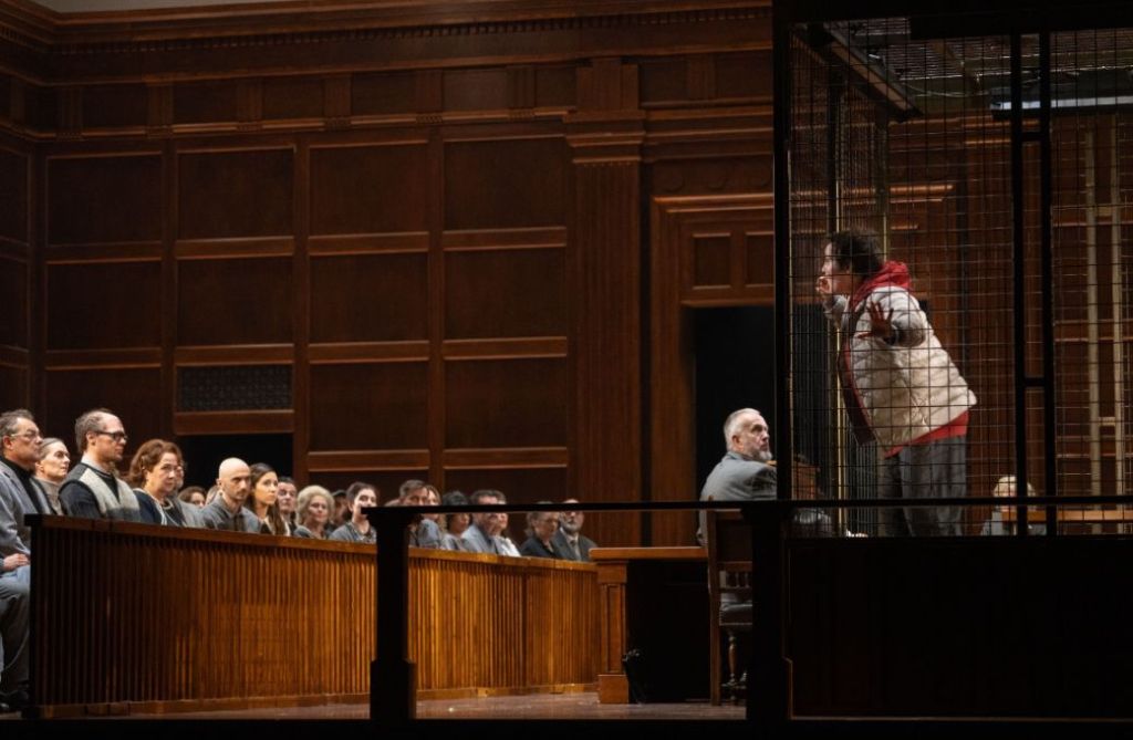 Tcherniakov situa l’obra en un tribunal que recorda a les sales de judicis russes, que tenen una gàbia on s’hi ubiquen els acusats. Tota l’obra té lloc en aquest espai, de manera que sembla que tota la peripècia de Joana d’Arc estigui explicada en un flashback que es relata durant el judici.