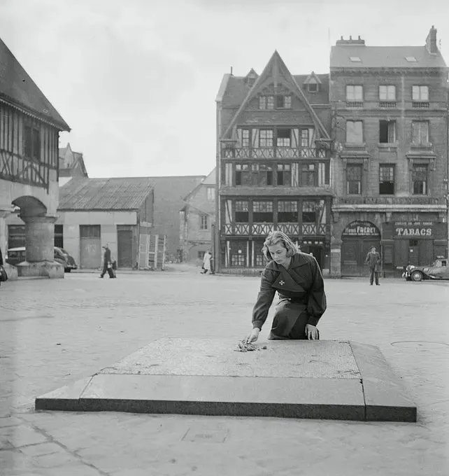 Aquí teniu a Ingrid Bergman visitant el punt on Joana d’Arc va ser cremada a la foguera, a la Place du Vieux-Marché a Rouen (França). L’actriu sueca va tenir sempre molta simpatia per la donzella d’Orleans, personatge que va interpretar en diverses ocasions, a Hollywood i a Europa.